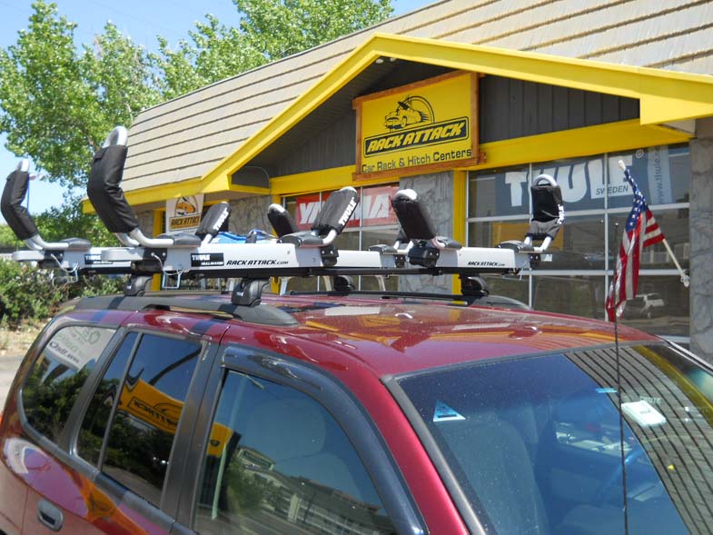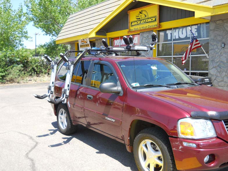 This 2008 GMC Envoy is setup with the Ultimate kayak system carrying two kayaks, both of which can be easily loaded without needing to lift your boat above your head.