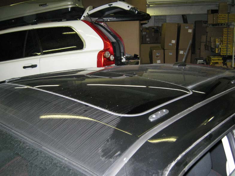 Finally, we added the Yakima Fat Cat 6 ski/snowboard rack. Note that the rack is 'jacked up' on one side...this is so snowboard bindings on the upside-down boards don't hit the roof. It is not always necessary to lift the rack like this, but the customer wanted to start this way just to be safe. Flattening out the rack is simply adjusting two screws on each carrier.