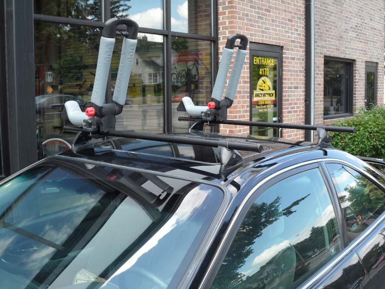 The Yakima Bowdown J Cradles are also perfect for cars that need to be parked in small garages, since with the turn of a knob, they can fold down from their up position (above) to a down position (below). When down, you can't carry a kayak, but the J-cradle lays out of the way, and you can pull it in and out of your garage without pulling off the whole rack.