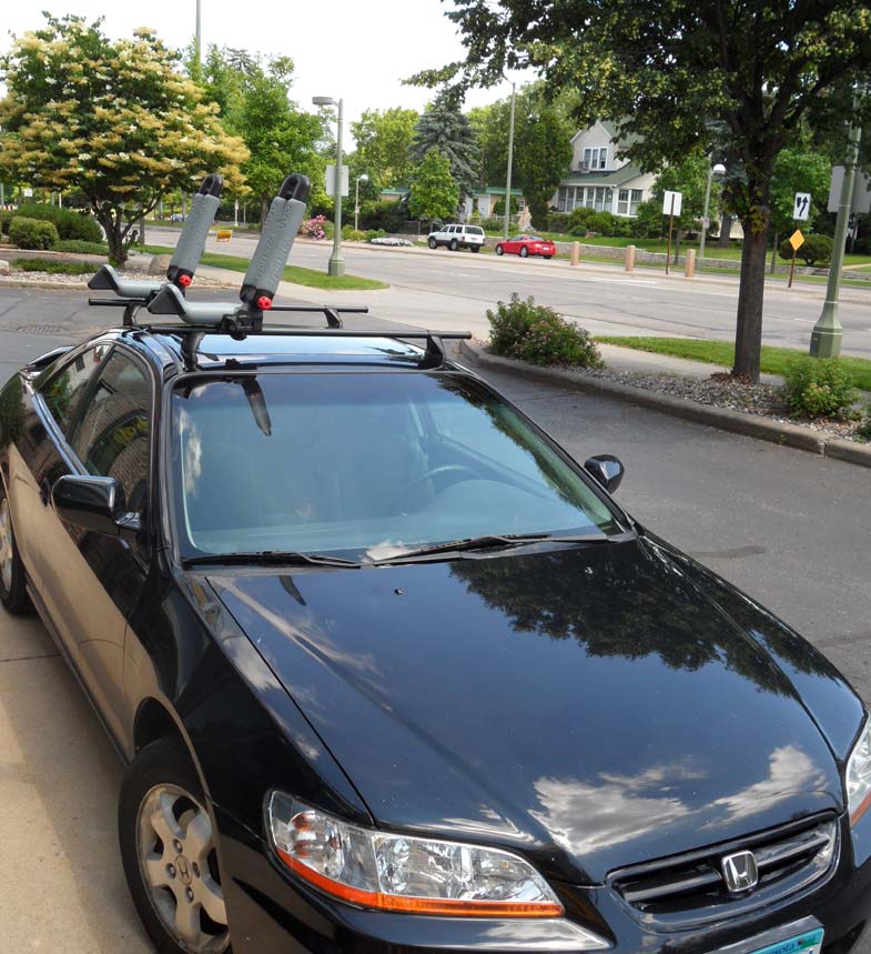 Today we had a customer with a 2001, 2 door Honda Accord who wanted to carry a 12ft Kayak on his roof. He was actually on the way to pick up his brand new Kayak at a local water sports retailer, so we were able to complete the custom install in about an hour. We went with a fixed point custom install option using the Yakima Landing Pad 7, with Control Towers and 48" round crossbars. We used this option to fit a longish load on a short roof.