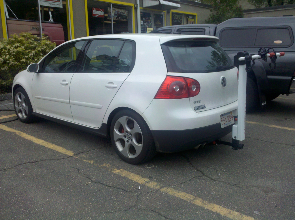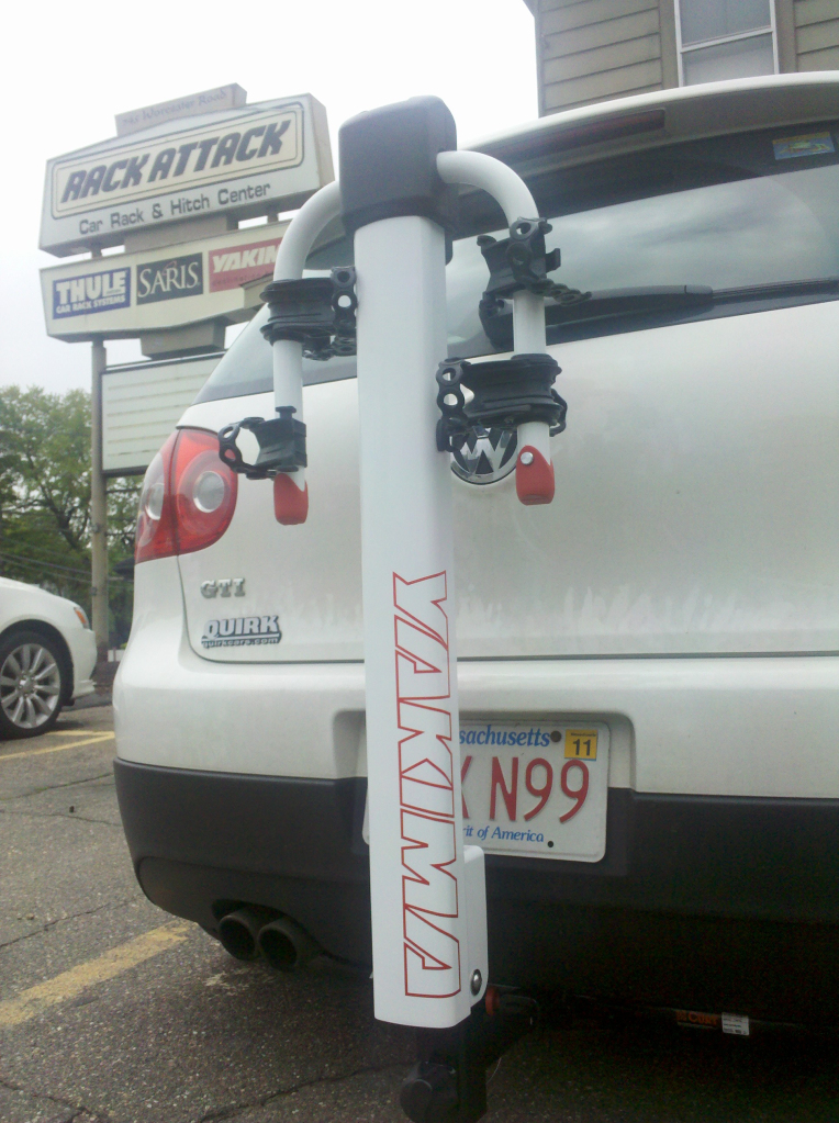 Yakima has come out with a new hitch mounted bike rack and it weighs less than 20lbs! We don't sell a hitch mounted bike rack that weighs less. We recently installed a Hitch on a 2008 Volkswagon GTI, and the customer decided to add on a Yakima High Lite 2 Bike carrier. The High Lite comes in both white and silver, and either a 2 bike or 3 bike option. Naturally, he decided to get the white with his white GTI.