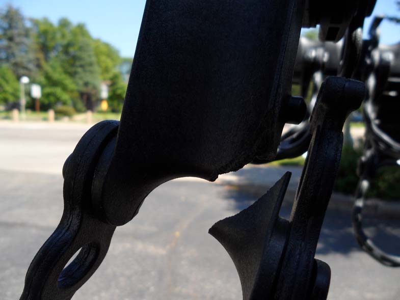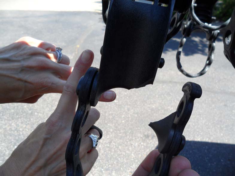The result was a snapped cradle button on the anti-sway portion of the Swingdaddy. Can it be fixed? I wouldn't, because even with a "super adhesive" the part is weak enough that you'll just have it snapping off in your hand later. Can it be replaced? Absolutely, Yakima sells replacement parts, including the anti-sway seats. Will it be easy to replace? It's not too big of a deal, you just have to take out the screws holding the cradles in, slide out the broken one, and replace with your new part. Good as new!
