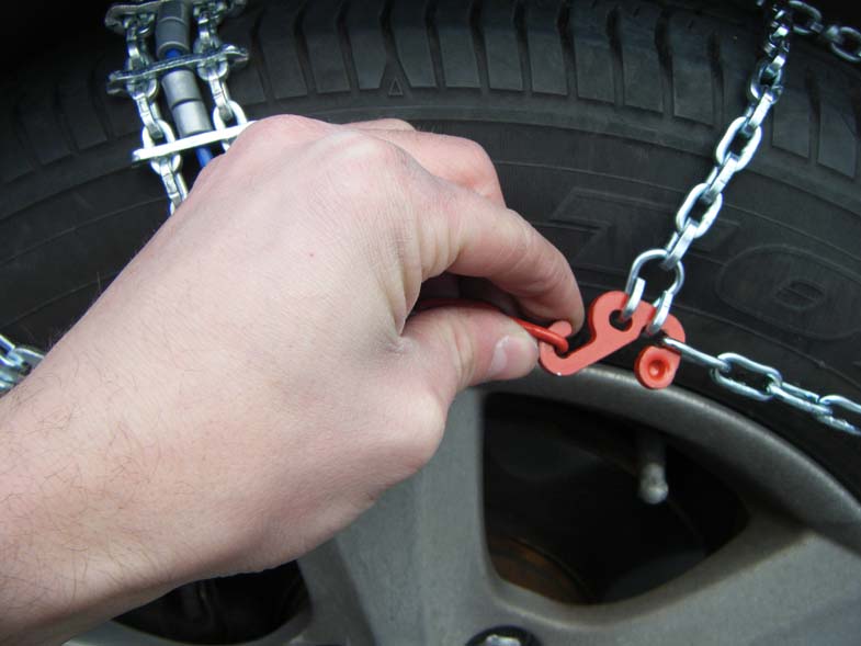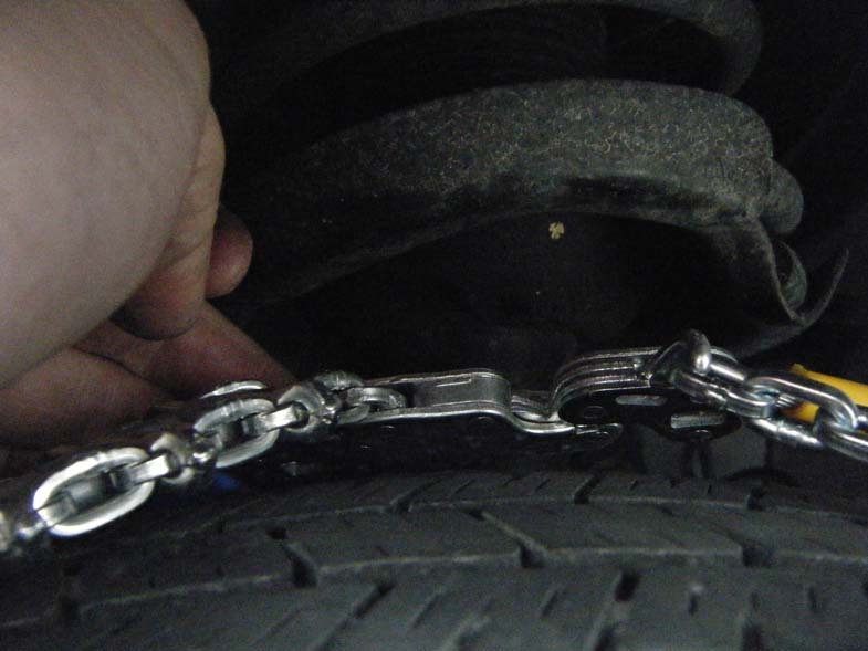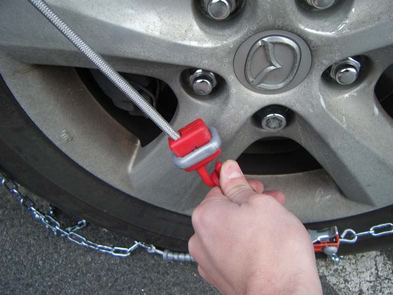 2.Put the Chains around the back of the tire with the blue cord farthest from you and the chains toward you: