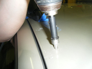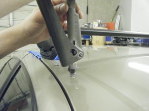 Once the rack is all set up where you would like it to be you can use a punch to mark where it is going to be drilled. Use a pilot bit first, 1/8th of an inch is a good choice, then use the bit it recommends in the Landing Pad 6/7 instructions. We use a Rota bit, which drills a perfectly round hole, but you can also use a normal drill bit. Blow away any metal shavings then use some touch up paint on the bare metal.